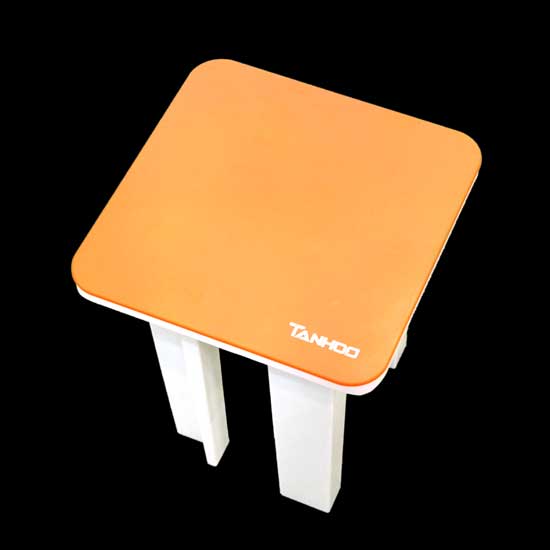 This exquisite plastic stool features an orange square top and white legs. The finely manufactured stool stands firmly on the ground. It is sturdily constructed for extended durability.