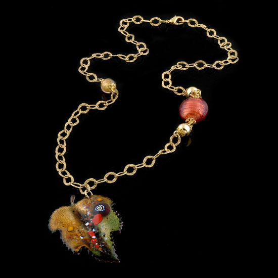 This decent necklace catches eyes of appreciation with the handmade colorful enameled left motif. The chain, also handmade, is plated in a golden yellow color. Occasional beads of sheer gold or red are arranged to give styles.