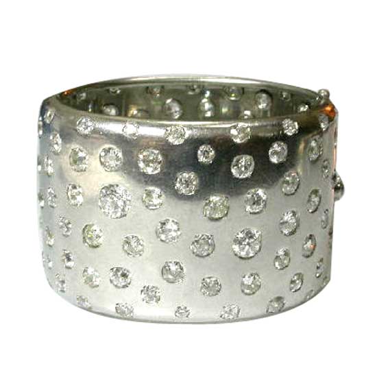 This is a Cartier art deco cuff bangle with a simple and deluxe appearance. It is made of quality platinum and inlaid with hundreds of diamonds ranging from 1.00 to 0.05 carat in assorted sizes. This exquisite bangle surely is an worthy addition to your jewelry collection.