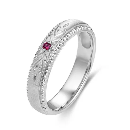 This elegant ring is crafted for women from durable and pure Platinum 950, featuring a stunning natural ruby at its heart. The deep red of the ruby stands out beautifully against the cool, silvery-white platinum.