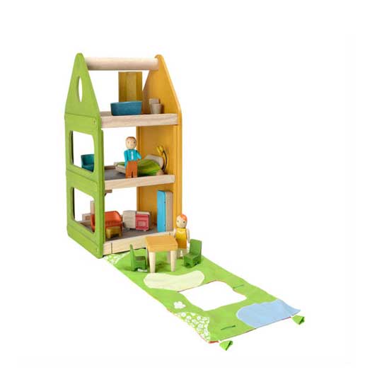 The three-storey house comes with furniture and two dolls for a variety of imaginative play. It comes with a panel to divide space. The 2 sided play mat serves as a wall and roof or a garden.