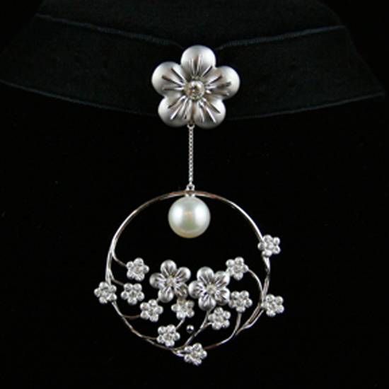 This is an earring from the designer's Plum Flower collection. Blossoming plum flowers are the main theme of the piece. It is made of sterling silver, imitation diamond and pearl.