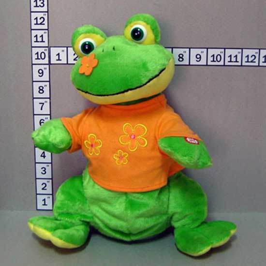 This plush frog in green wears an orange hued shirt with attractive floral patterns. Switching on by hand, the frog will turn its arms up and down while singing. This vivid plush frog is an ideal companion for your little ones.