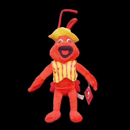 This red plush toy features a rabbit-like design for grabbing your attention. The toy wears a yellow hat and a striped yellow vest. This distinctive plush toy is CE certificated.