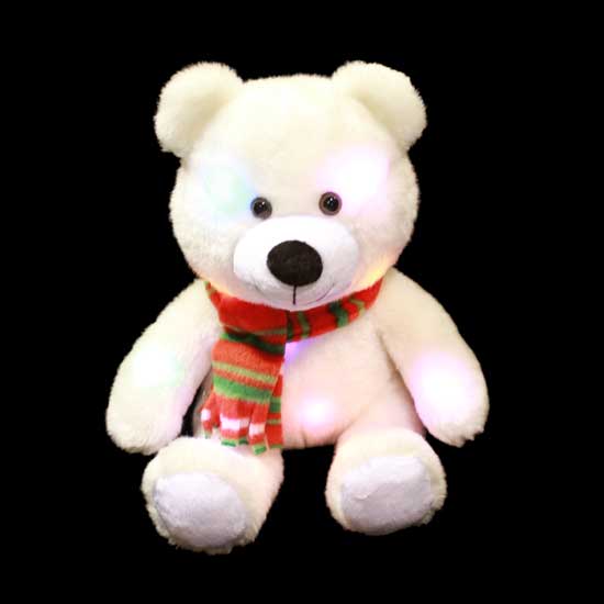 This is a plush toy that boasts an adorable bear appearance. It is decorated with a multi-colored scarf for a decorative touch. This attractive plush toy is surely an ideal bed companion for little kids.