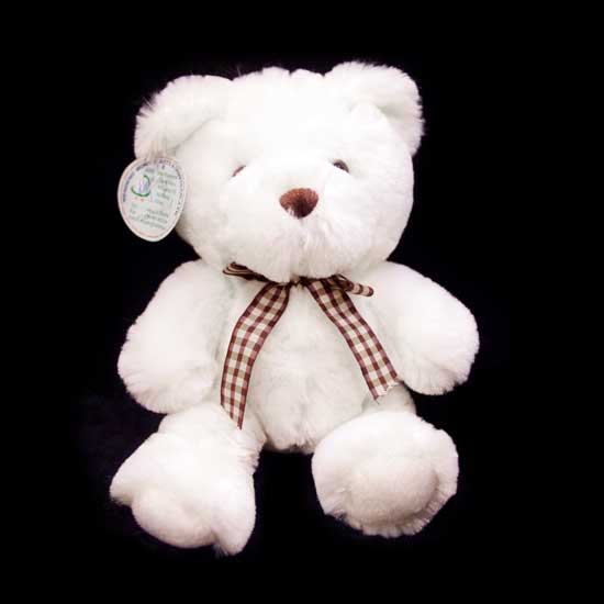 This plush toy bear features a white appearance decorated with a check bow at the neck. It is constructed from PV plush for a soft touch. This cute toy bear is ideal for your beloved little one.