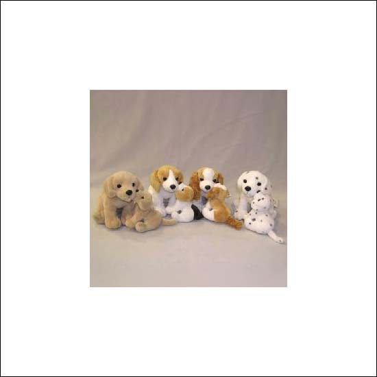 The soft stuffed dogs are in pairs, with a baby dog kissing the mama dog''s cheek