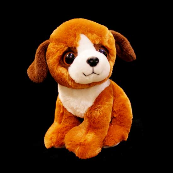 This plush toy dog in brown features a triangle white design at the nose and mouth position, dark brown eye circles and ears. It is made of polyester for durability. This cute toy dog makes an ideal choice for accompanying your kids.