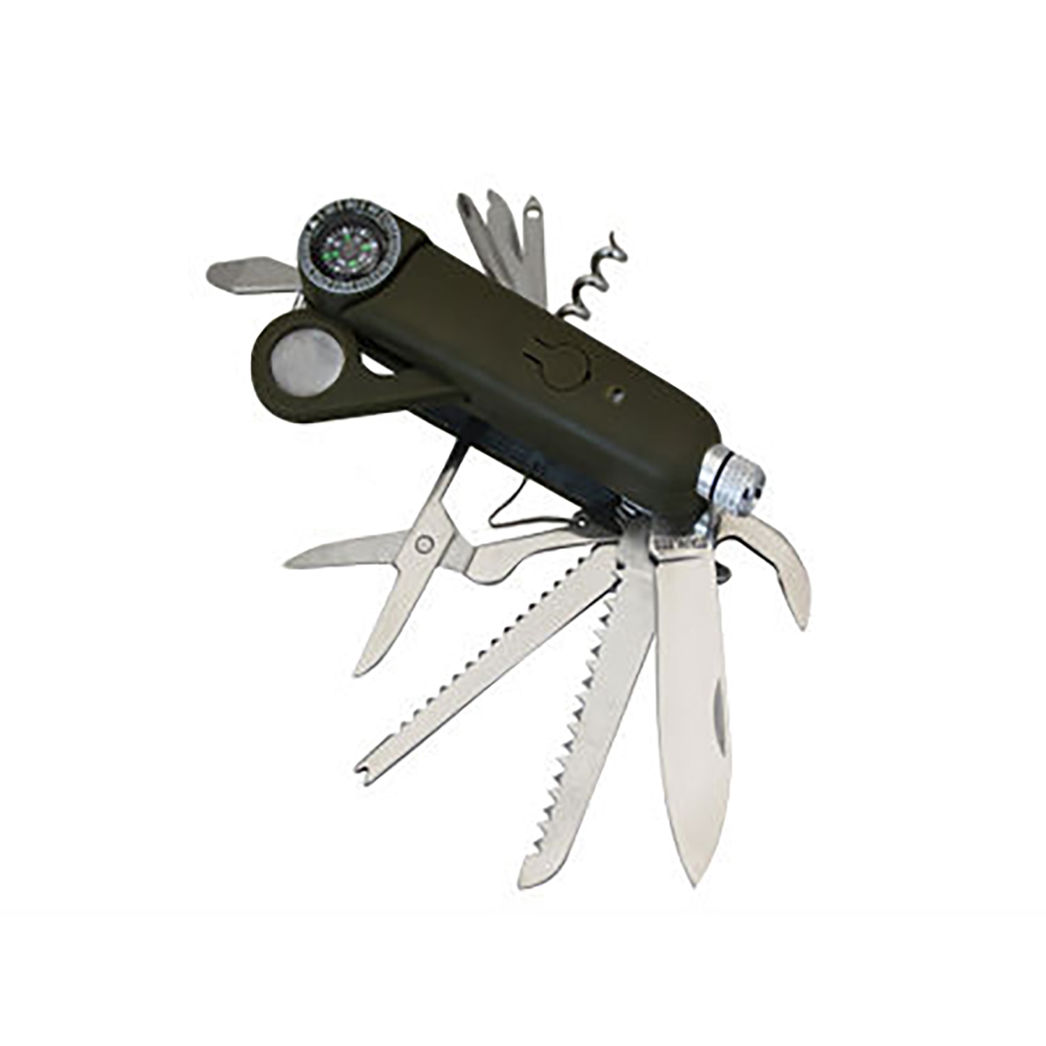 Multi survival knife with pop-up LED flashlight including the following features: pop-up LED flashlight (cell battery included), compass, magnifier, sharp knife blade, wood saw, fish scaler, hook remover, scissors, can opener, bottle opener, flathead screwdriver, Philips screwdriver, reamer and punch, nail file, nail cleaner, corkscrew, small key ring.