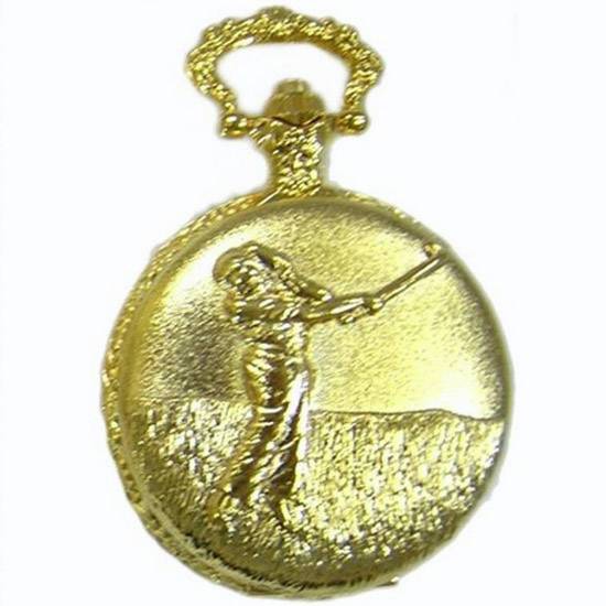 This pocket watch features an open-front design with a loop for attaching to a chain or string. It boasts a golf-themed engraved patterns in a gold tone, adding a touch of luxe to the entire piece. This beautiful pocket watch makes a great accessory to enhance your collection.