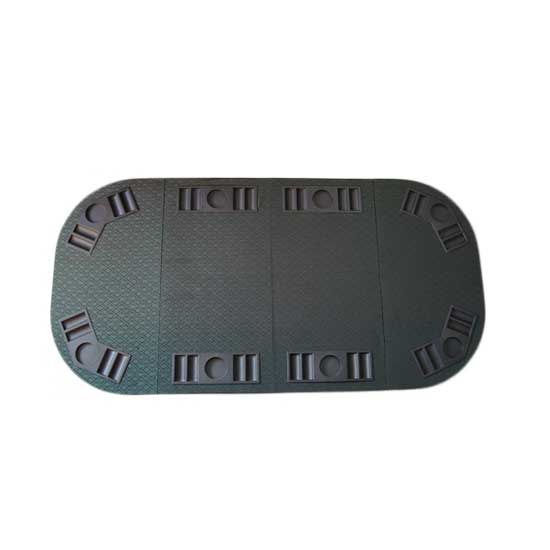 Displayed is a four-folding poker table top with a dark-green surface. It comes with 8 individual trays for beverages and poker chips or playing pieces. A nylon carrying bag is included for convenient storage and carrying.