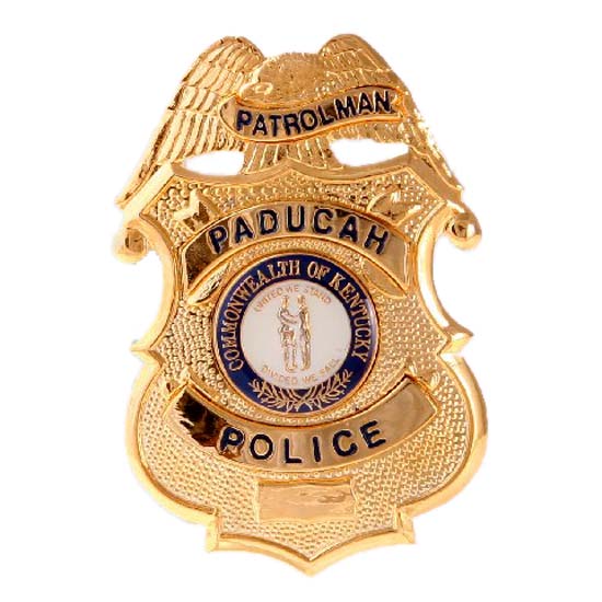 This police badge is uniquely shaped with a polished rim. Its top is embellished with an eagle pattern with partially spread wings. The embossed surface showcases a unique style.