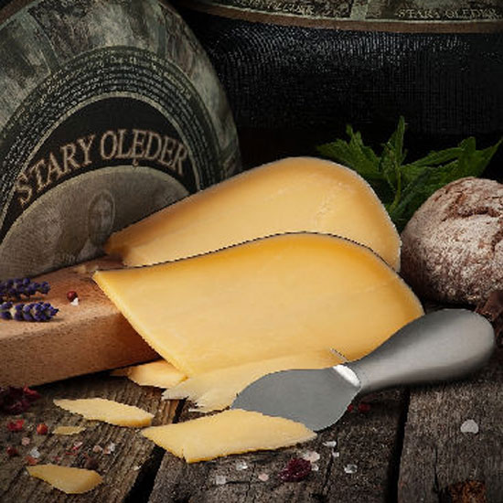 The Stary Oleder is the first long maturing cheese to be produced in Poland. The maturing period lasts for 6 months or more. This cheese in a color of noble amber is characterized by an intensive aroma and taste of ripe fruits, with detectable traces of slightly hot spices and walnuts. It should be crumbled and served at an ambient temperature. The Stary Oleder is a perfect match for barreled dry wine and long-maturing medium-dry wine.
