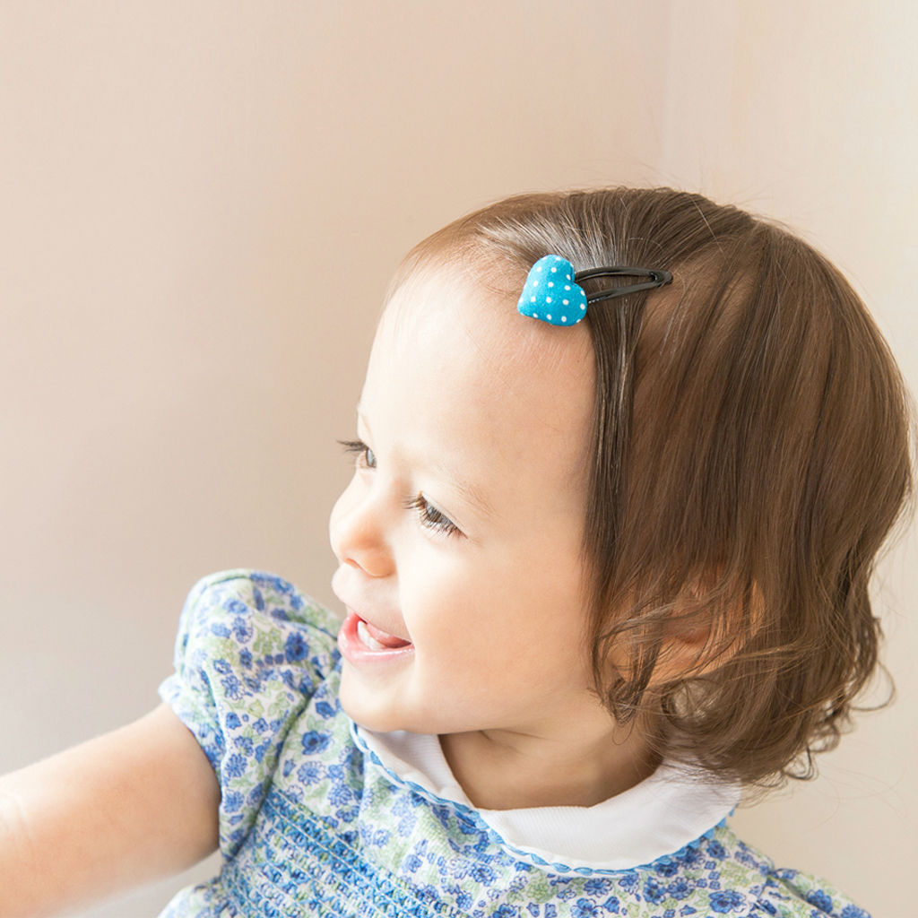 Simply clip on this adorable fabric-made hair clip and tons of brimming irresistible cuteness will be borrowed to your lovely baby girl. Brightened by the exquisite detail, the bouncy heart accent is further beautified by the tiny polka dots. With this appealing adornment firmly sat on the attached snap clip, it can easily win the heart of any girls. To satisfy your starving desire, various sizes and colors are available for you broad selection.