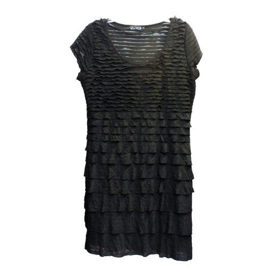 This dark-toned thigh-length dress features a scoop neck and a pair of cap sleeves. The allover ruffled design showcases a feminine flare. This classy one-piece dress complements high heels or ballet flats in a dainty way.