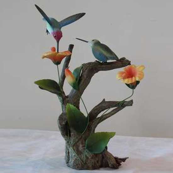 Highlighted is a polyresin decoration featuring two humming birds resting on a branch. The branch comes with flowers and buds to display extra beauty. The whole set of decoration boasts great details and fantastic colors to offer a lively appearance.