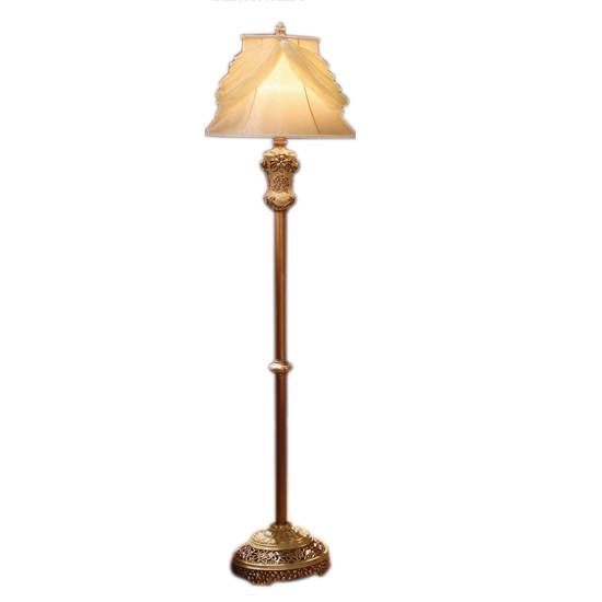 The floor lamp features a classical lampshade with an elegant curtain roll surrounding the exterior of it. The shade is made with a semi-transparent, wireframe, fabric mesh cover.