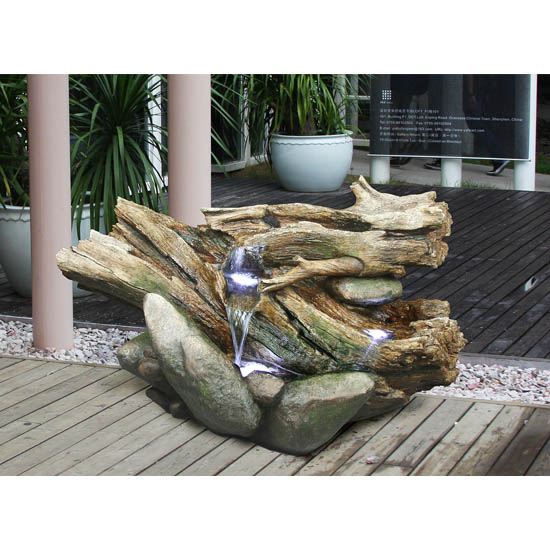 This lighted fountain boasts a unique trunk-like design with tasteful patterns. The outdoor fountain features clear water tumbling from top down into the reservoir below. Its soft lights magnificently light up your garden or patio décor with elegance.