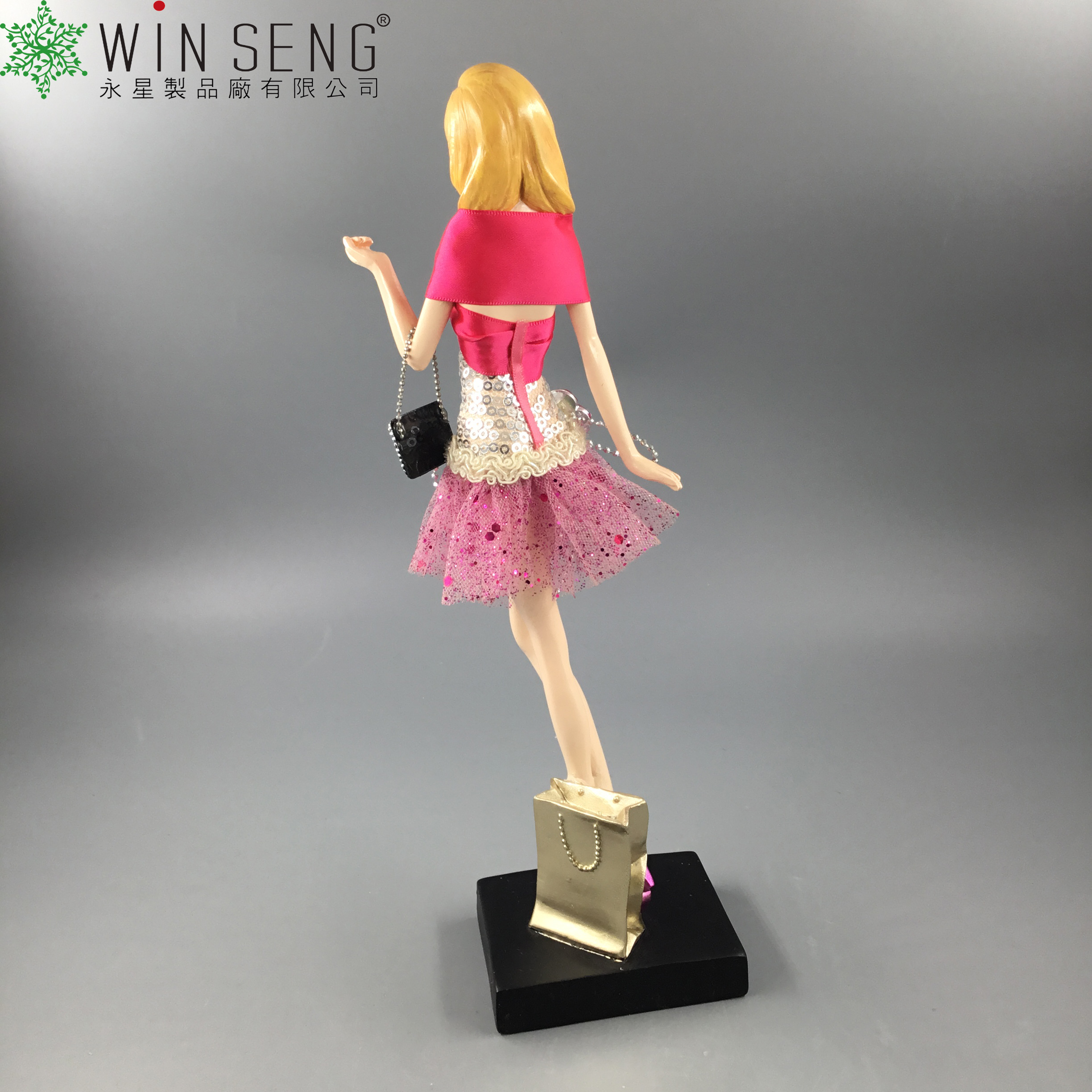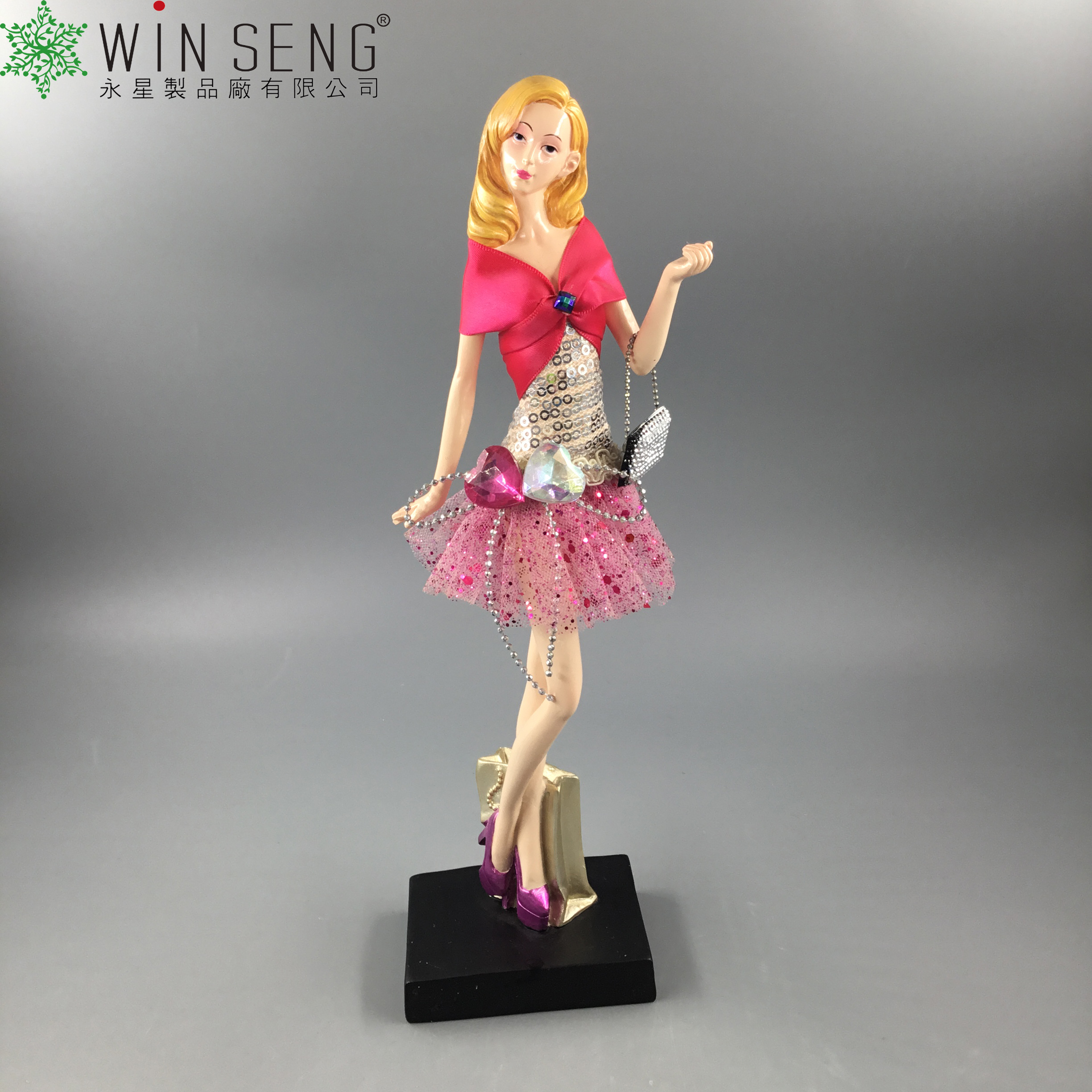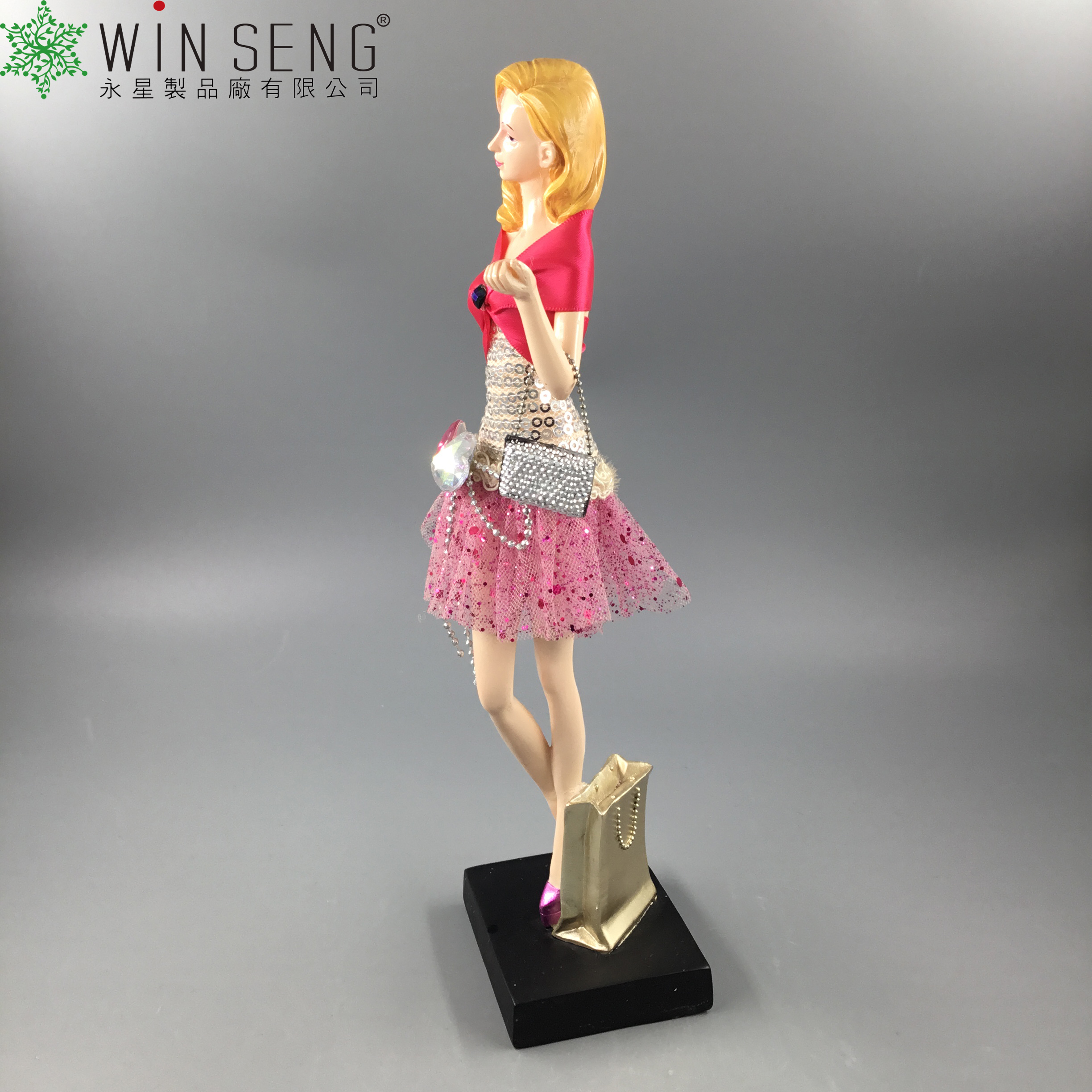 • Item Name: polyresin sparkle pink dress lady with bag figure decoration