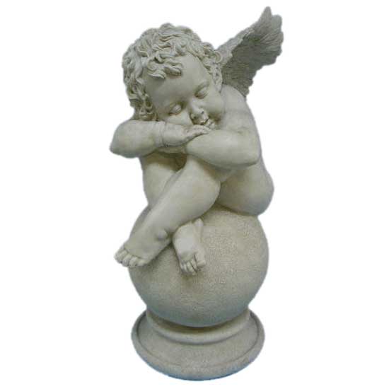 The polystone angel is crafted with attention to detail. It showcases a lifelike sleeping posture. The whole piece stands with a round-shaped base with a sphere on top.