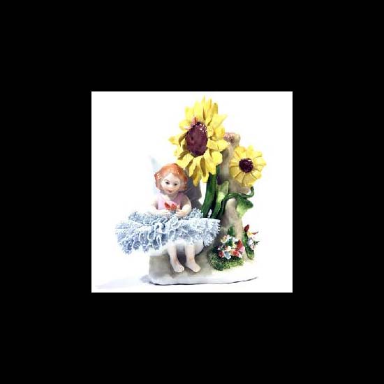 The fairy in the porcelain decoration is sitting on a stone next to some sunflowers