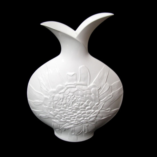 Stretching across the glistening white surface of this bone china vase is an embossed ginger flower pattern in impressive details. Splitting outwards to each side in the form of two delicate flower petals, this medium-sized vase saves space while bringing a touch of refined elegance to your living rooms, offices, restaurants and other interior designs.