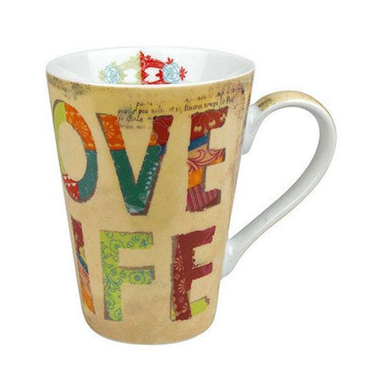 This is a mug designed with a cone shape. It features a porcelain body with a sturdy handle. The exterior is printed with colorful patterns and words for a touch of style.