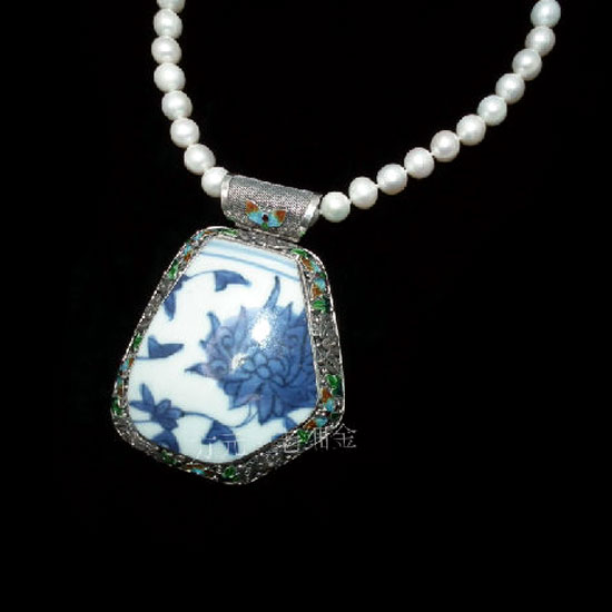 This porcelain pendant comes with a floral pattern. The frame is made with delicate metalwork by filigree technique. It is ideal to pair with a beaded necklace for a graceful and charming look.