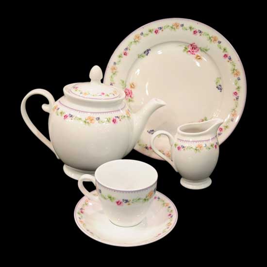 - Comes with a teapot, a milk pitcher, a cup, a saucer and a plate.