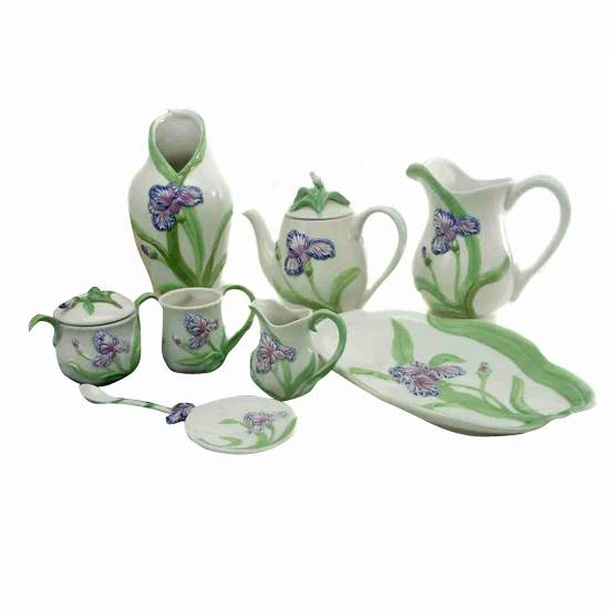 This set of porcelain ware has various items of tableware which includes a teapot, a cup, a plate, a vase and other items. It is desigen with a flower pattern with leaves and also implies the natural, simple lifestyle.