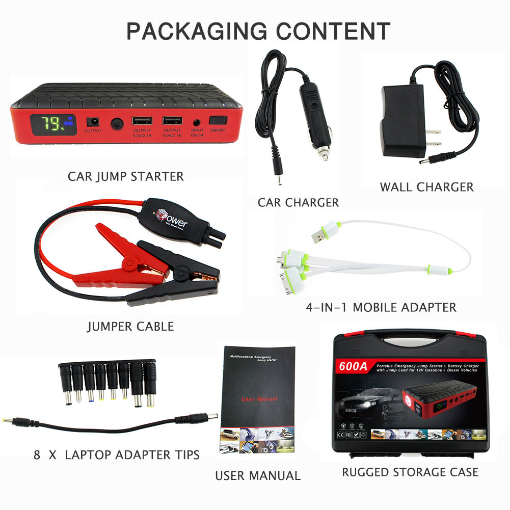 Accessory:Jumper cable,AC adapter,Car Charger,Phone charging cable,Laptop charging cable