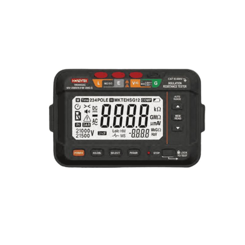 The HK4432C Insulation Resistance Tester is a high-precision portable megohmmeter designed for electrical contractors, industrial maintenance teams, panel builders, utility technicians, EPC projects, and professional tool distributors. Featuring a 6000-count LCD display, selectable test voltages up to 2500V, and a wide insulation resistance range of 0.01MΩ to 200GΩ, this tester delivers dependable performance for insulation diagnostics across a wide range of electrical systems.