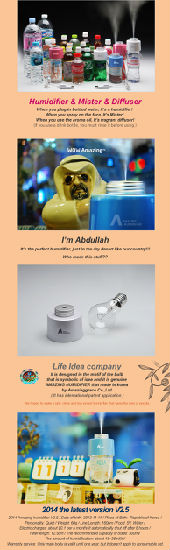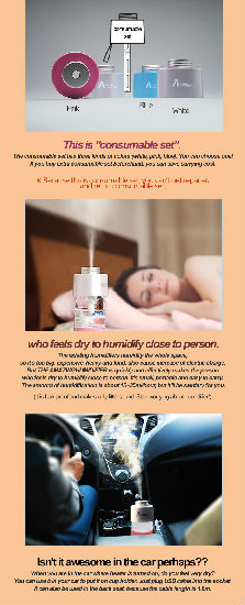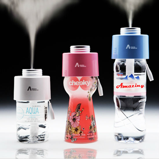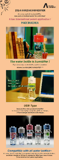 "Amazing Humidifier" combines with bottled water that increased cleanliness by taking out of the water tank. Also it runs for 8 hours with 300ml bottled water and it is powered by smartphone charger or cable.