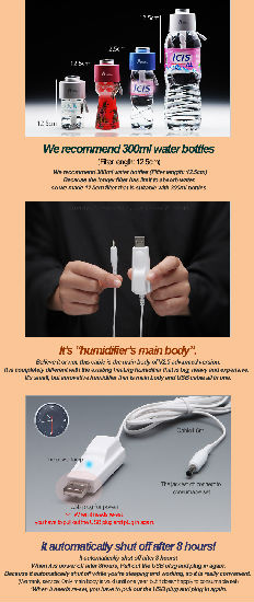 Portable humidifier 1. used bottled water 2. easy to use anywhere 3. connect USB cable 4. low cost and maintenance