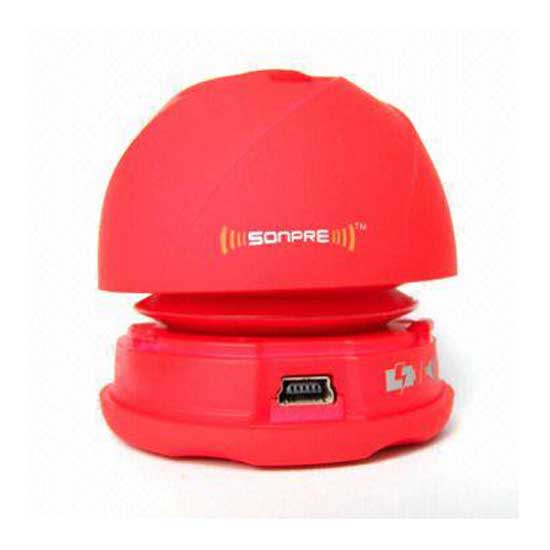 Displayed is a portable USB speaker in red. It comes with a patented expansile resonator design for extending the space of resonance. It is applicable to various kinds of digital player devices, such as MP3 players, laptop computers and mobile phones.