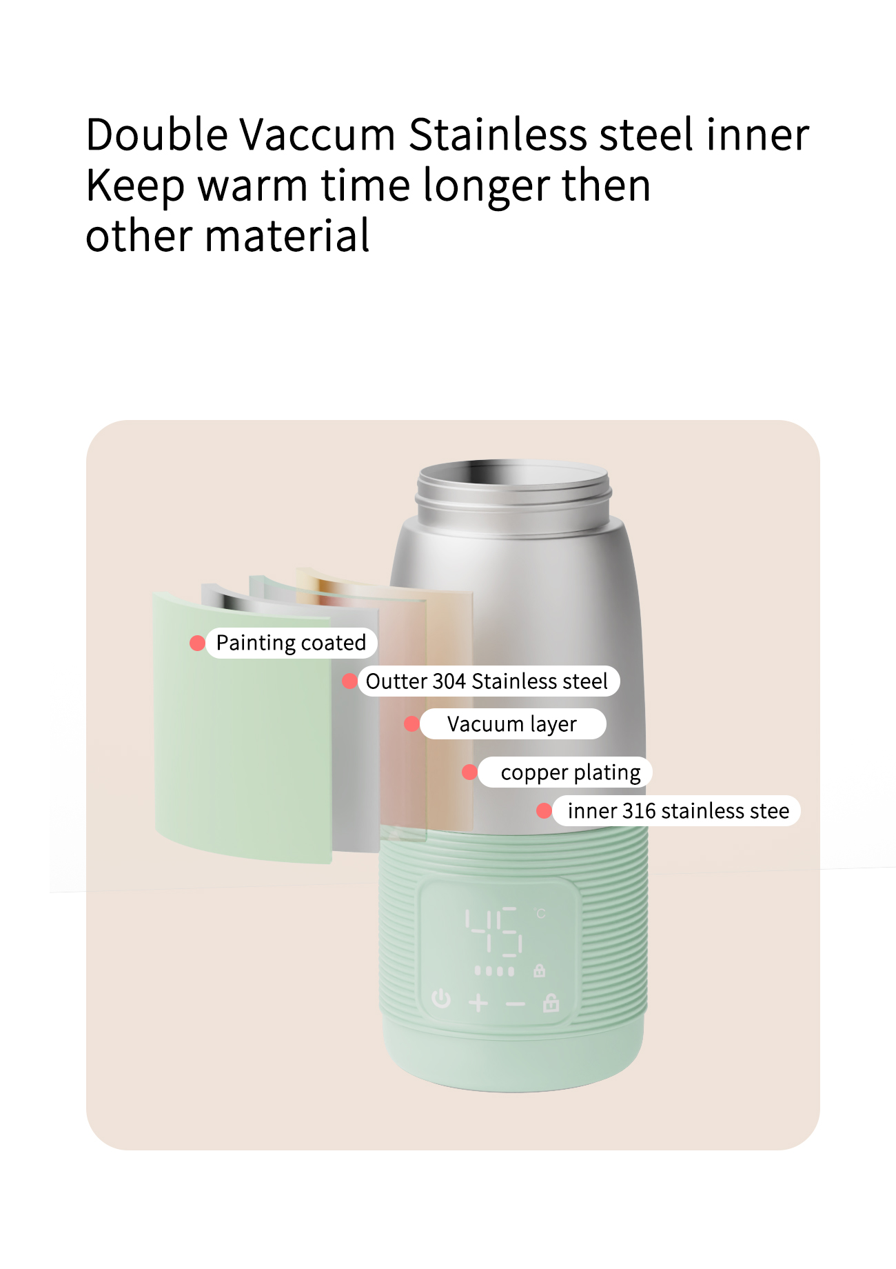 11. 350ml portable bottle warmer dimensions: Dia9cm*height22.5cm; 500ml portable bottle warmer dimensions: Dia 9cm* height 25cm