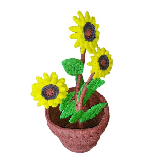 Displayed is a toy yellow sunflower that comes in a brown pot. Made of soft material, this lovely potted sunflower can be placed anywhere for decorative purpose or as a toy. This potted sunflower is a fun choice for homes and children.