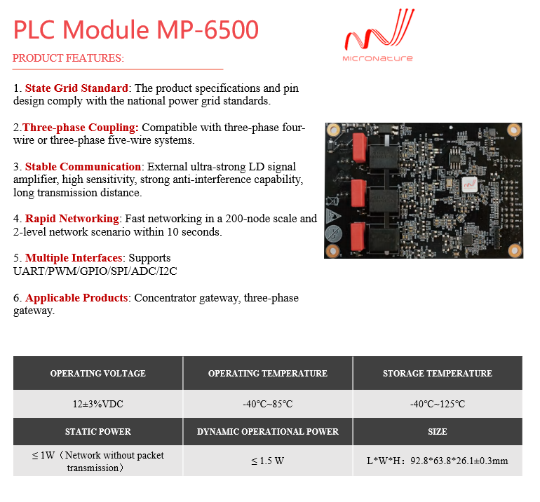 MP-6500 PLC Module is a fully integrated Power Line Communication (PLC) communication module with ultra-compact size, compact structure, and simple wiring. It can be widely used in various PLC instant communication applications, such as smart street lighting, smart homes, smart parking, central air conditioning, and ubiquitous power Internet of Things (IoT) terminal devices.