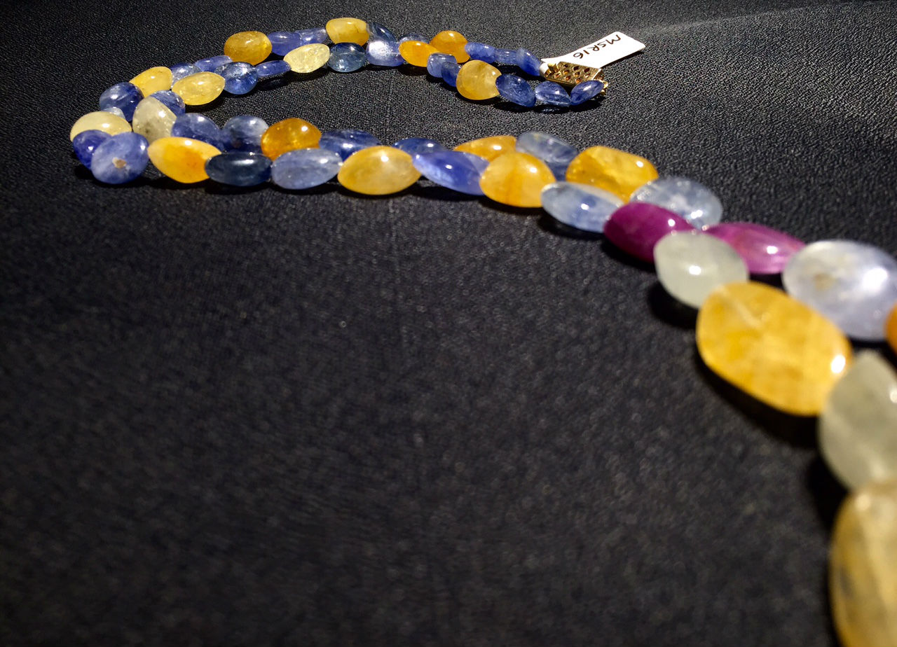 Precious stone tumbled strand, with natural ruby & blue-yellow sapphire drilled
