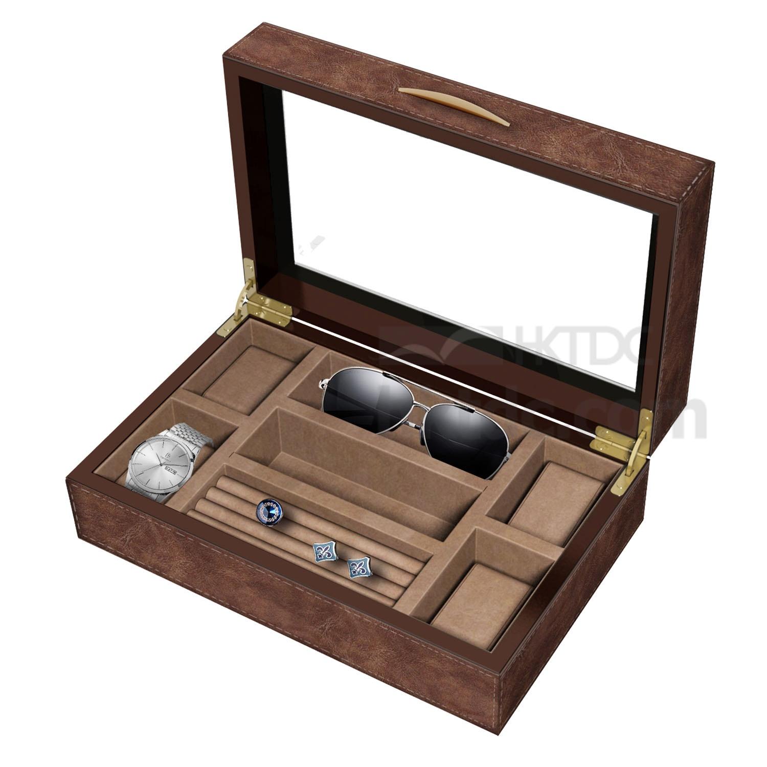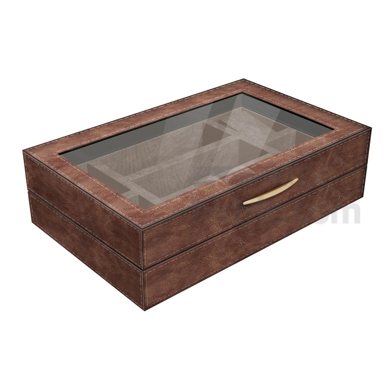 Premium Rust Brown Leather Jewelry Box With Glass See-Thru Top