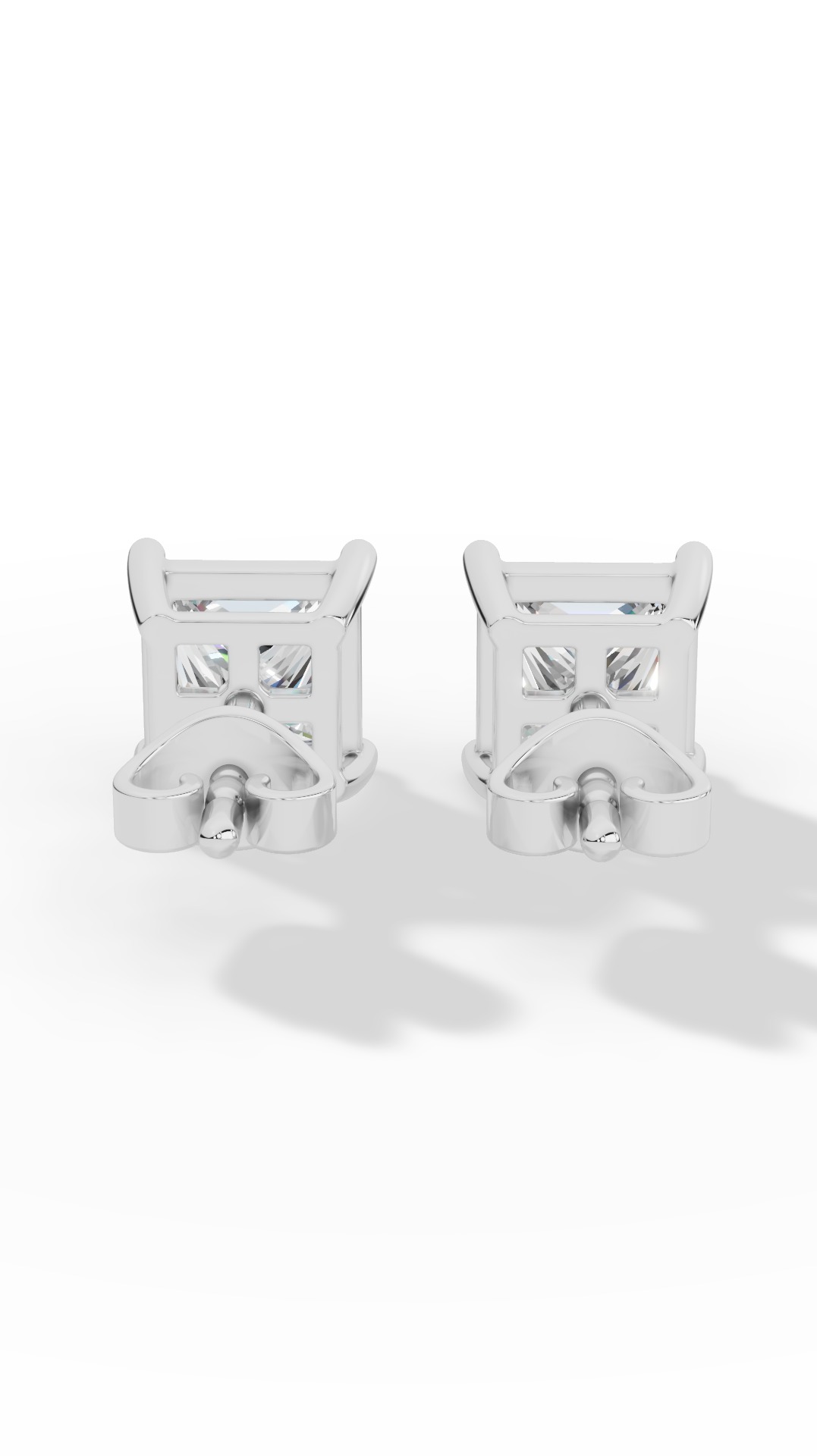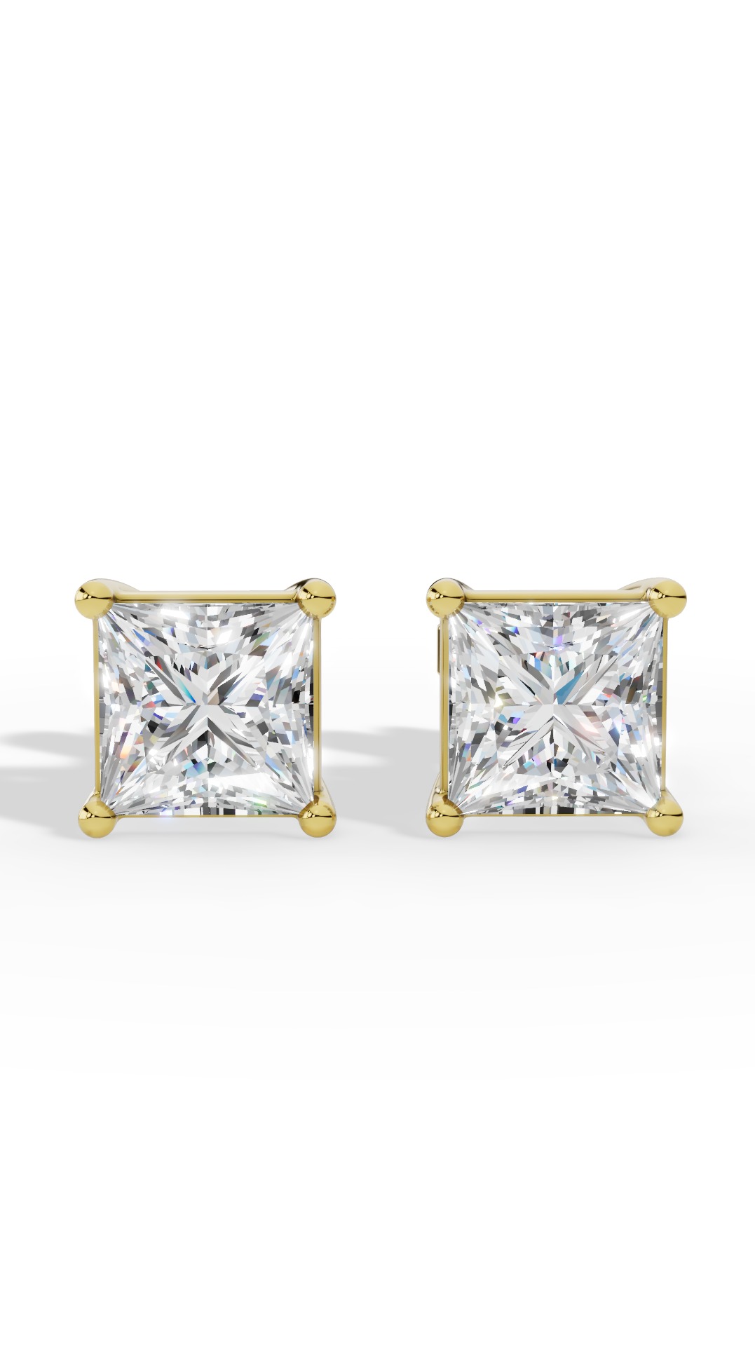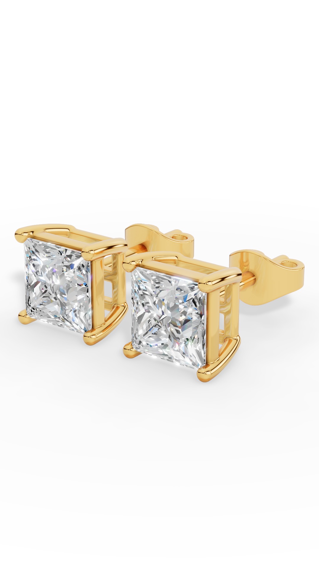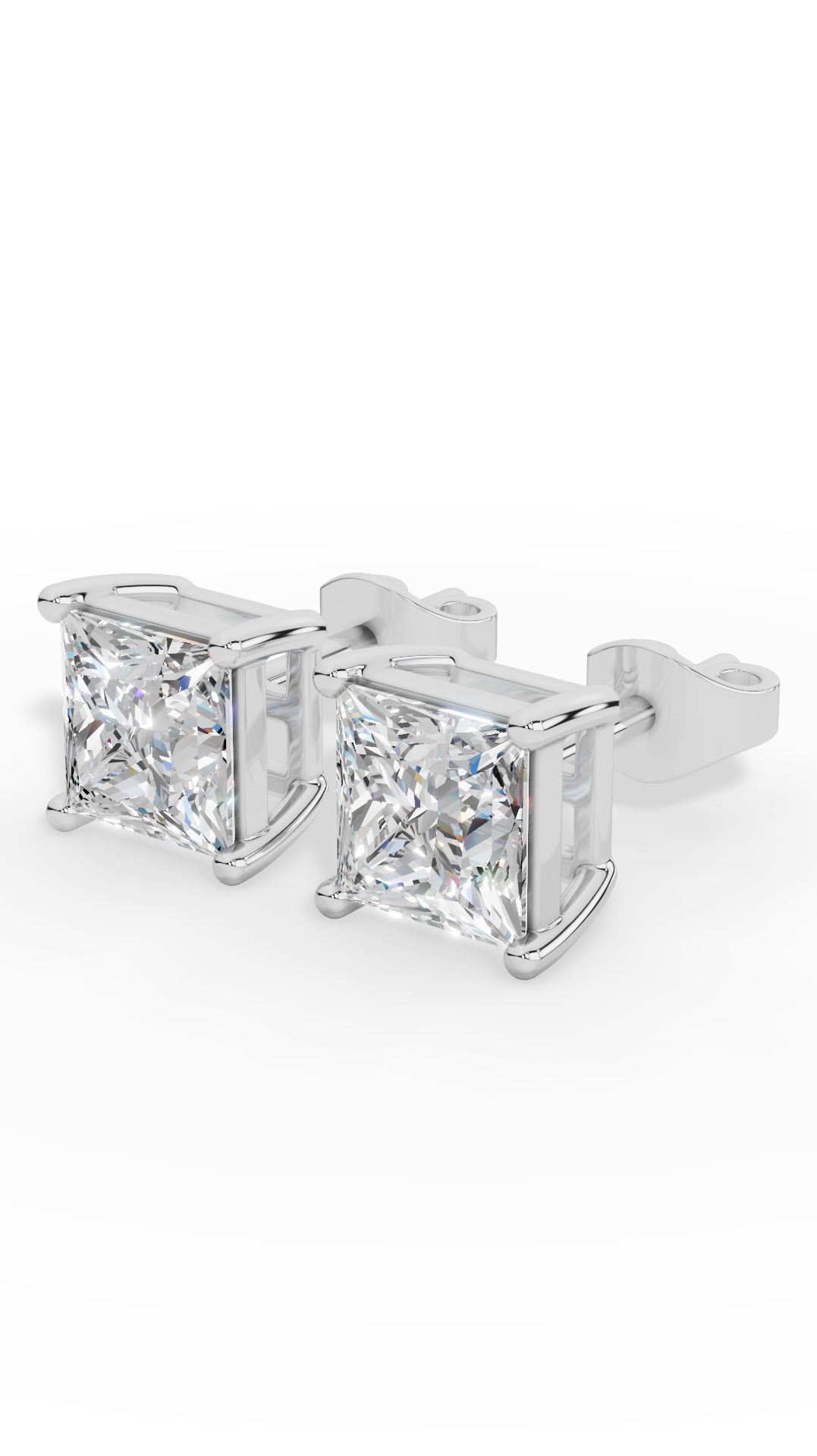The princess cut solitaire four prong basket lab-grown diamond stud earrings feature a sharp square diamond securely set in a classic four-prong basket, offering brilliant sparkle and timeless elegance.