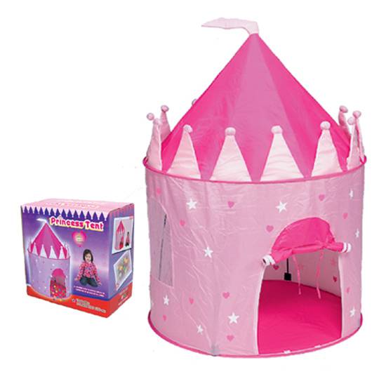 This princess tent is shaped like a castle and is ideal for play indoors and outdoors. The castle tent comes with a roll-up door and has a meshed window to facilitate ventilation. The pink tent has stars and hearts printed on the exterior.