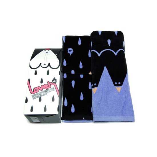 This bath towel features 100-percent cotton construction with fancy bordered edges. It comes in black and blue with rain drop patterns for a decorative touch. This bath towel set is highly absorbent for added utility.