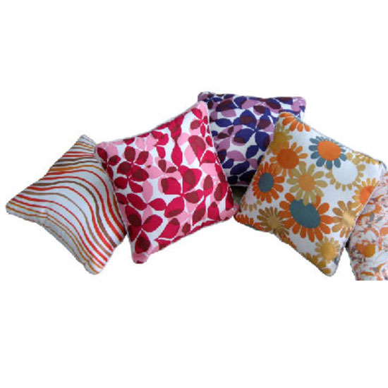 Shown here is a collection of printed cushions with floral patterns in bright colors. These fancy cushions are suitable for any rooms. Cushions of various materials are also available.