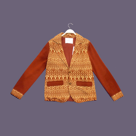 This is a jacket designed in a burgundy color. It is printed with sophisticated patterns in yellow for added style. This jacket goes well with assorted trousers for an eye-catching look.