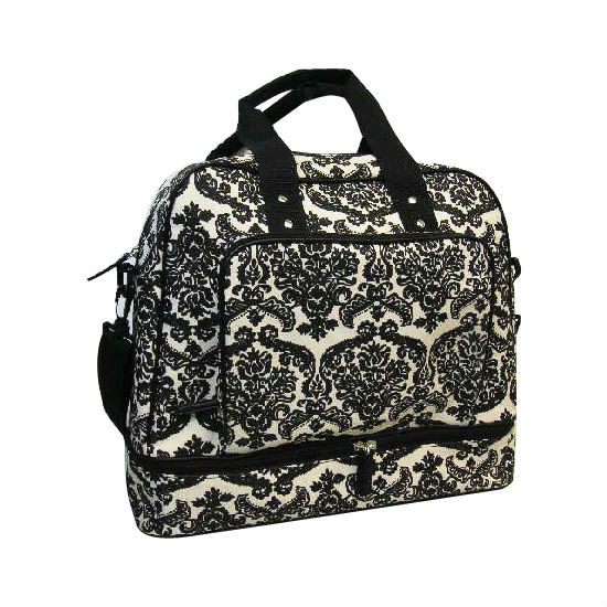 Printed microfiber overnight bag with bottom zip around pocket for shoes, top with zip main compartment and with front zip pocket.