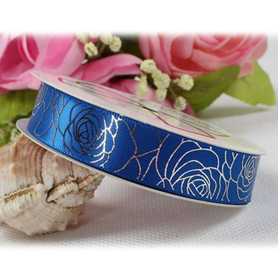 This is a reel of ribbon with an elegant appearance. It is made of robust polyester in blue. Printed with silvery rose patterns, this ribbon will add a touch of elegance to your gift.