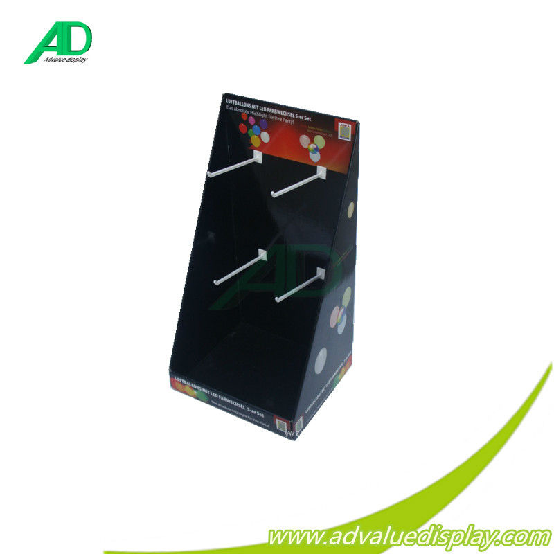 Light but robust, this cardboard counter display provides a more flexible alternative to traditional product exhibition. Supported by a rectangular base, a backing cardboard and two slant-cut sideboards, it offers a spacious room for hanging your products together with 4 equipped hooks.