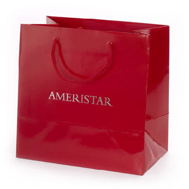Add a sense of luxurious charm to your gift with this glossy deep red paper bag. The foil blocking on the front adds a unique visual dynamic to your brand and oozes an air of quality and sophistication. The soft rope handles add a touch of class to this high gloss laminated gift bag. Exudes your class with this eye-catching bag.