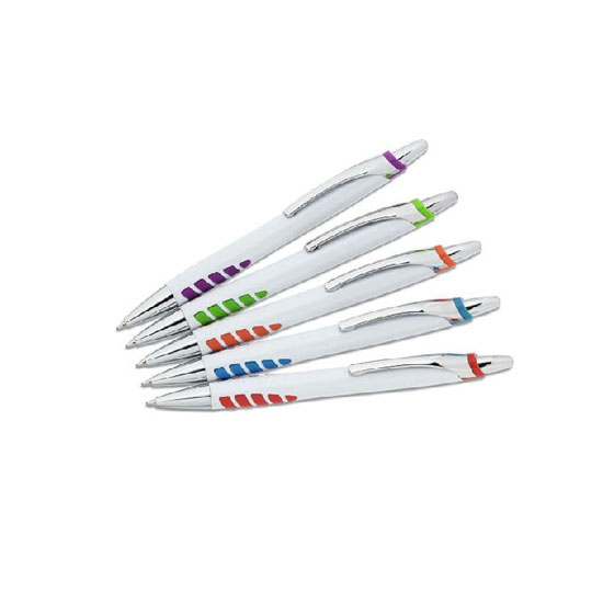 This is a ball pen with a dainty and stylish design. It comes in white with colorful accents for added style. This pen is a great choice as a gift for promotional use.